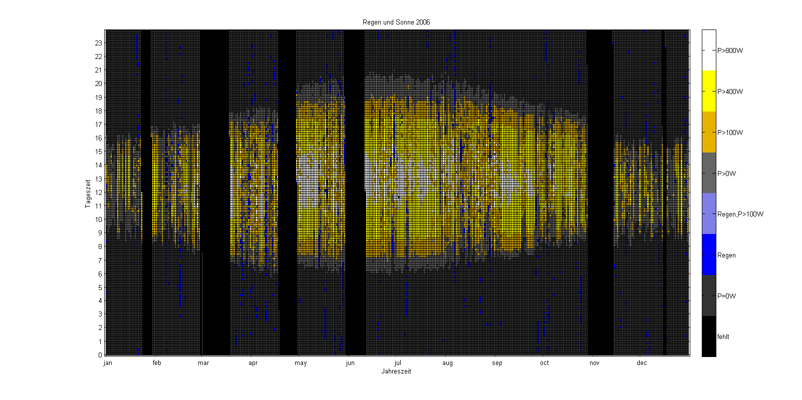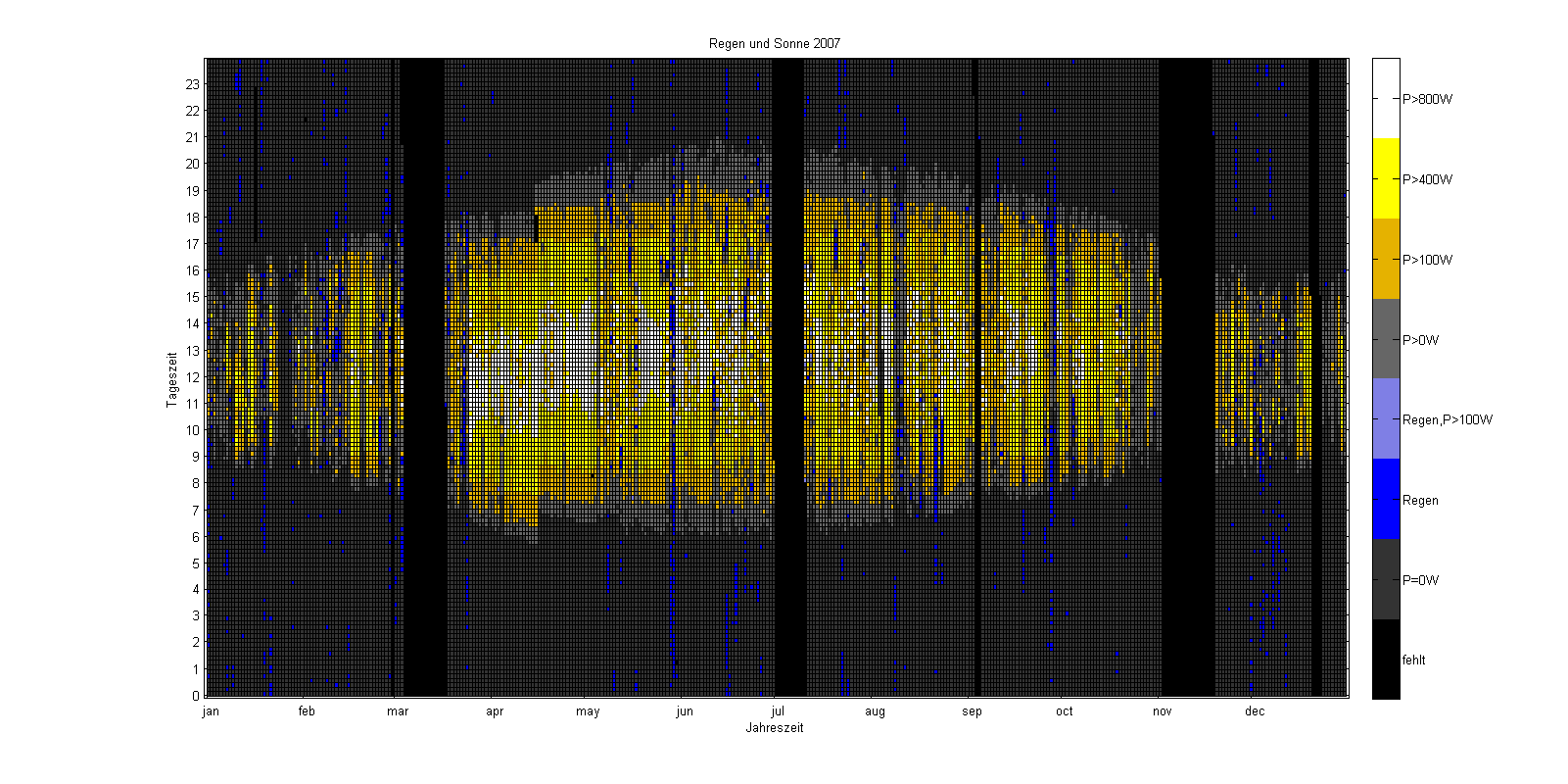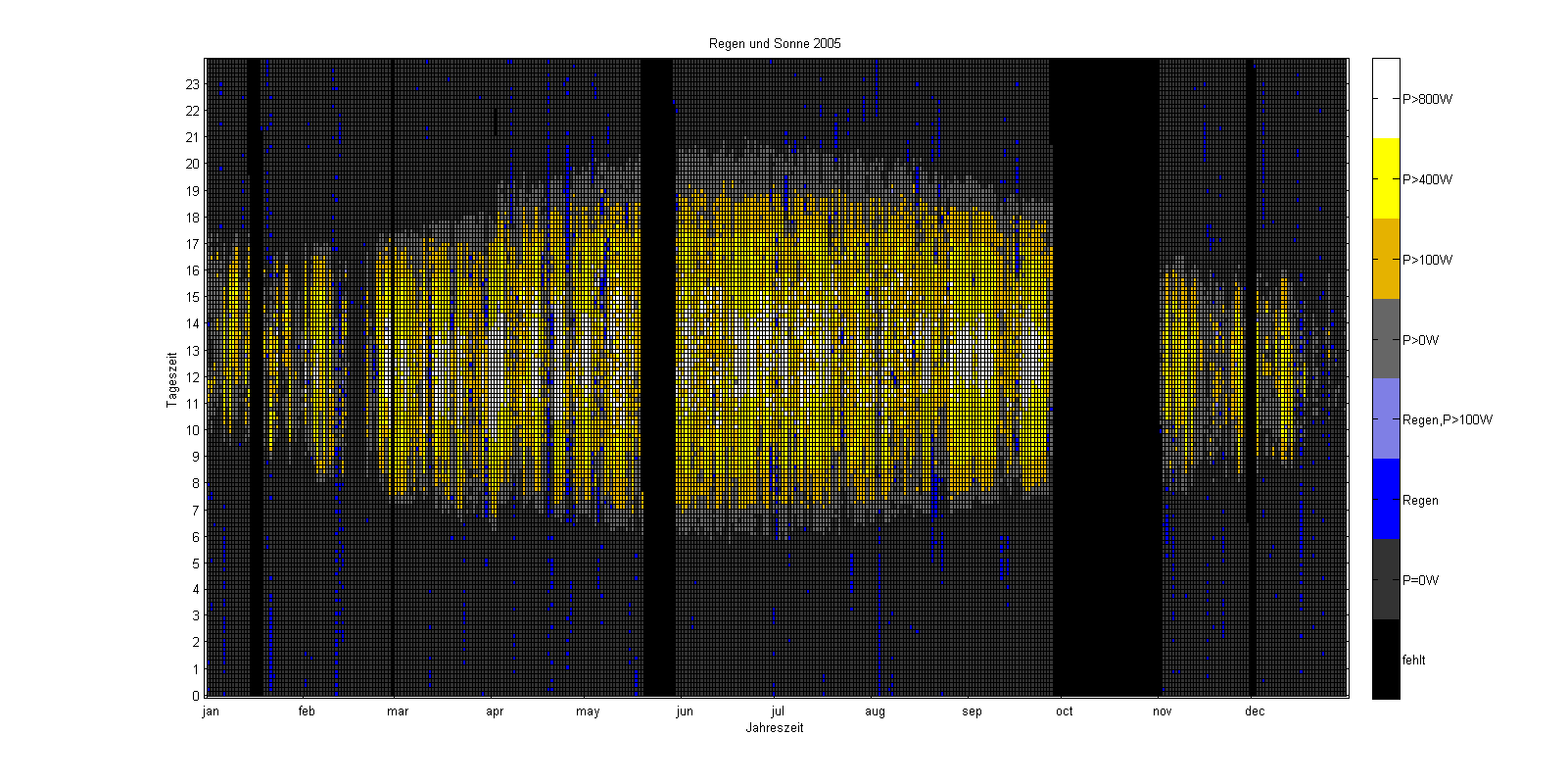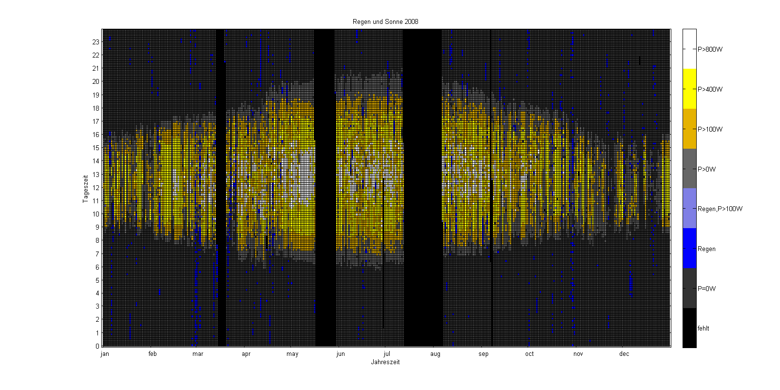 Folgende Ansicht zeigt eine Klassifizierung nach Solarleistung und Regen (siehe Legende rechts vom Bild). Auch hier sind die kurzen und trüben November- und Dezembertage deutlich erkennbar, erst die letzten Tage des Jahres waren wieder richtig schön.
