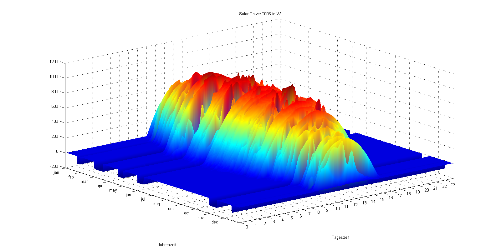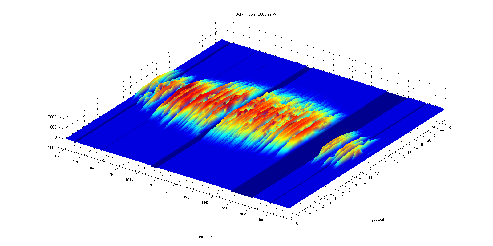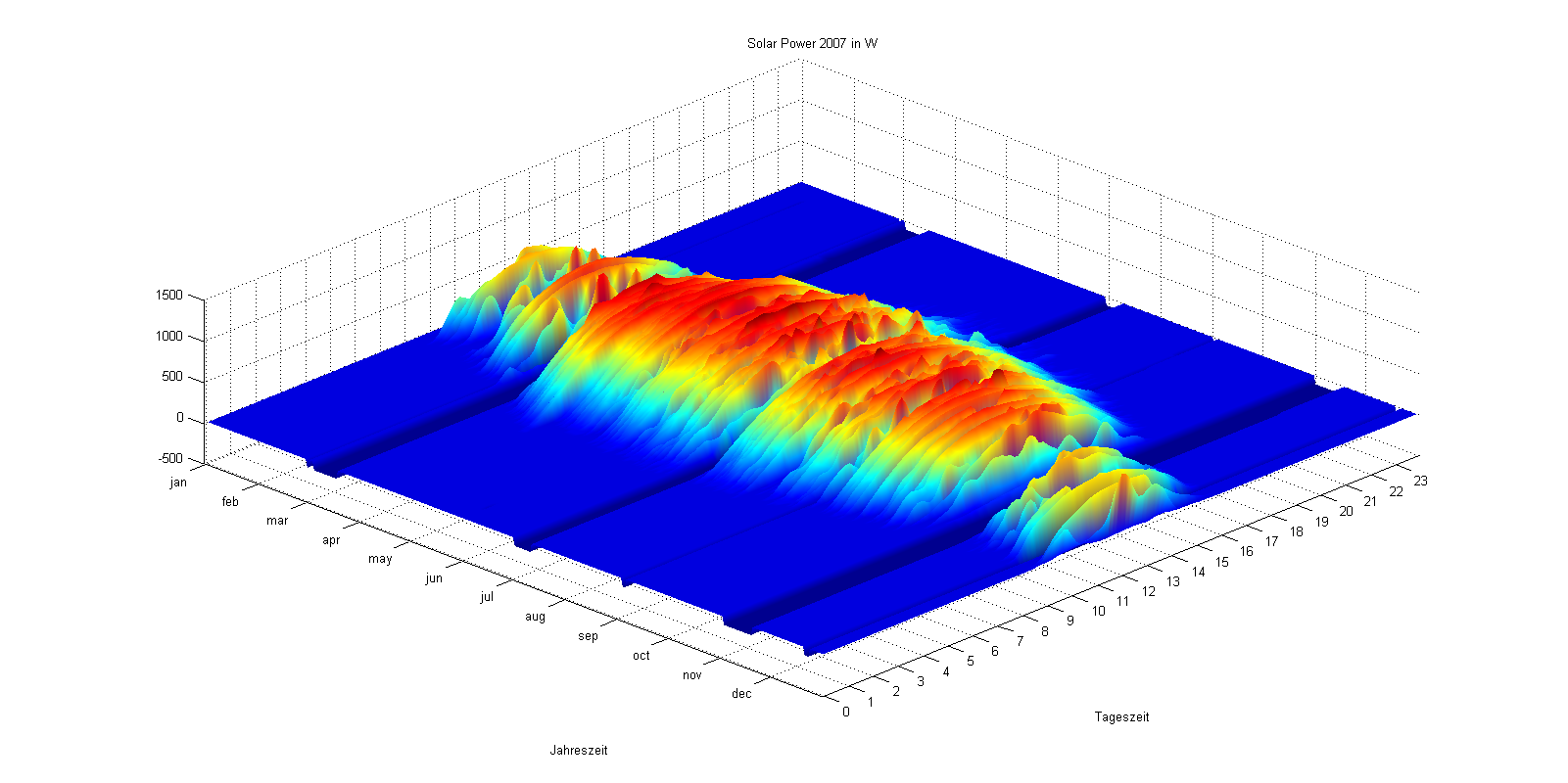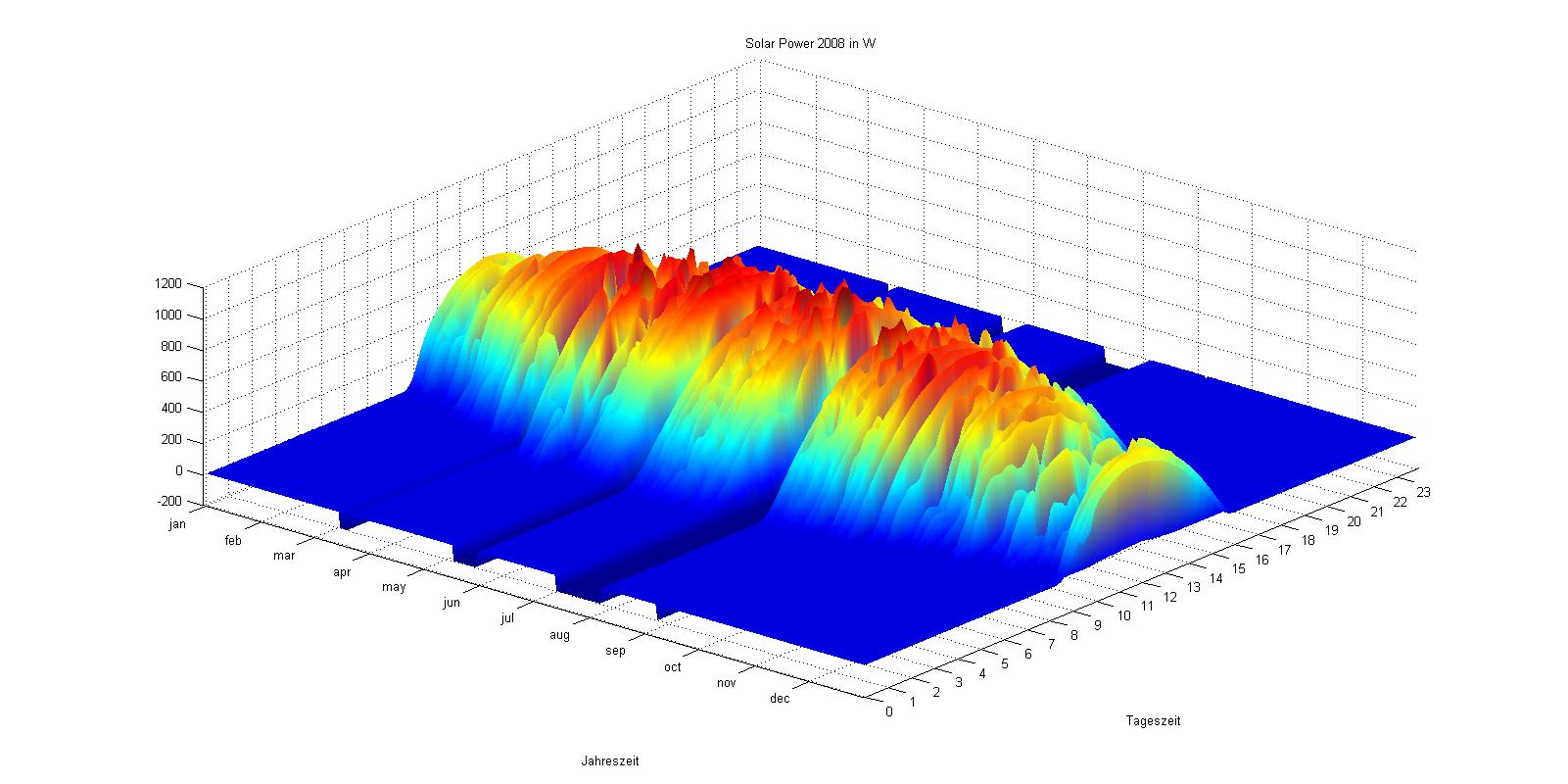 Die 3D-Darstellung zeigt sehr anschaulich den Verlauf der Solarleistung über Tages- und Jahreszeit. Die "Gräben" mit negativer Leistung sind Bereiche fehlender Daten. Der Sprung des Sonnenaufgangs im April (und weniger deutlich sichtbar irgendwo im Herbst) ist durch die dort von mir vorgenommene Umstellung auf Sommerzeit zu erklären. Interessant ist auch, dass bei wechselhaftem Wetter Leistungsspitzen auftreten, die deutlich über die Leistung bei einem klaren Tag hinaus gehen. Dies ist wohl durch zusätzliche diffuse Strahlung durch Wolken, die nicht die Anlage verschatten, zu erklären. Evtl. spielt auch die niedrigere Zelltemperatur eine Rolle.
