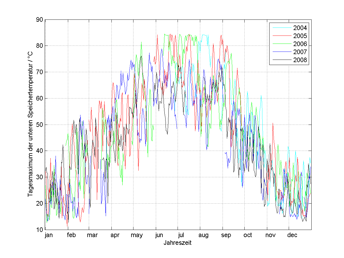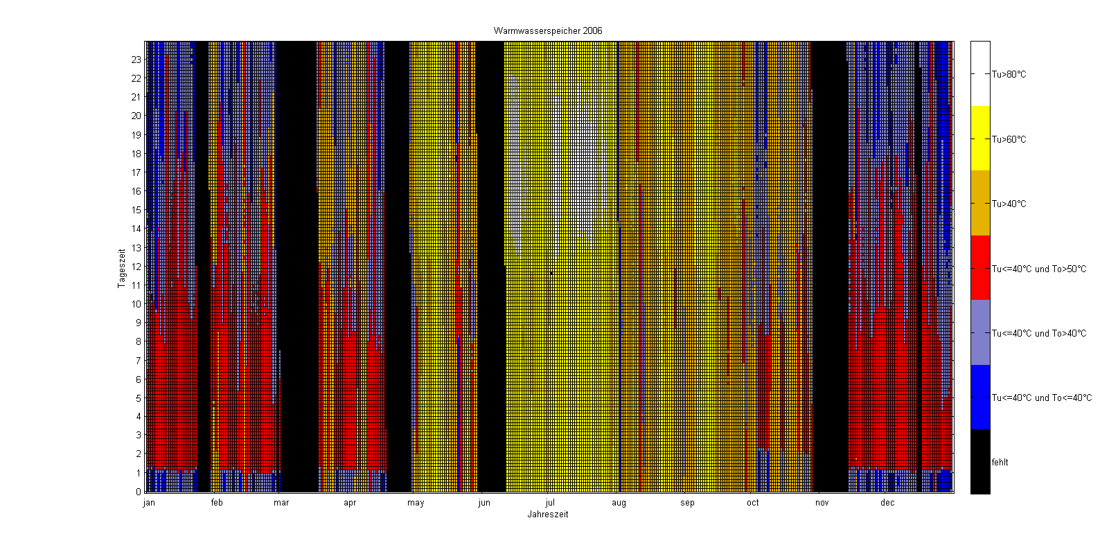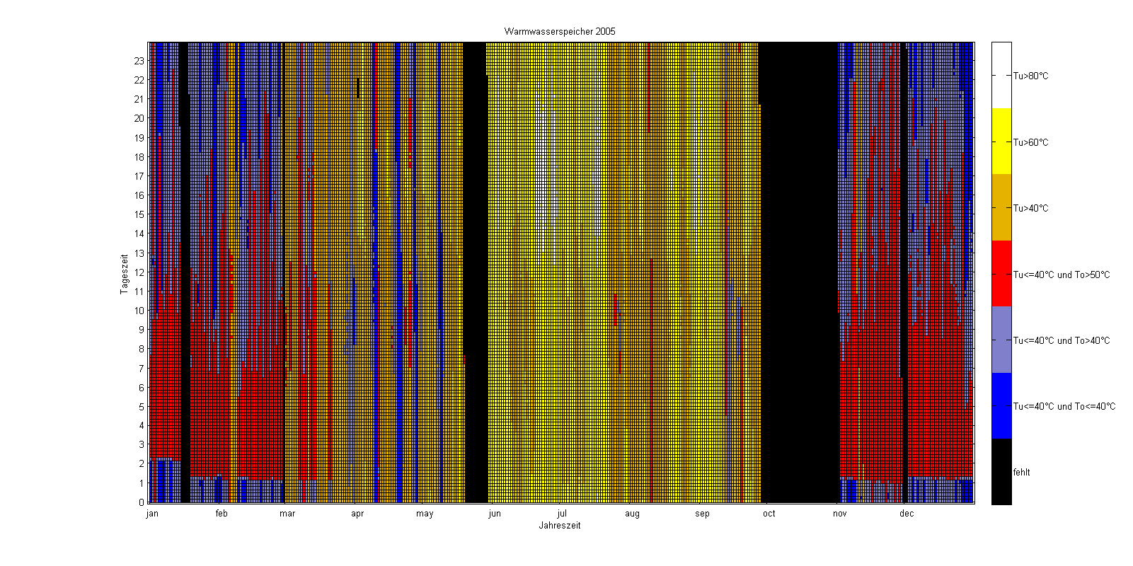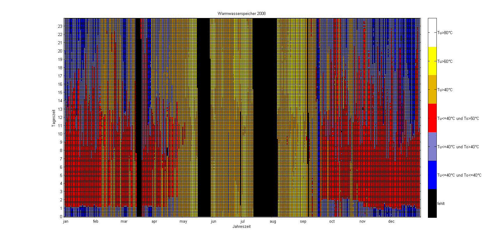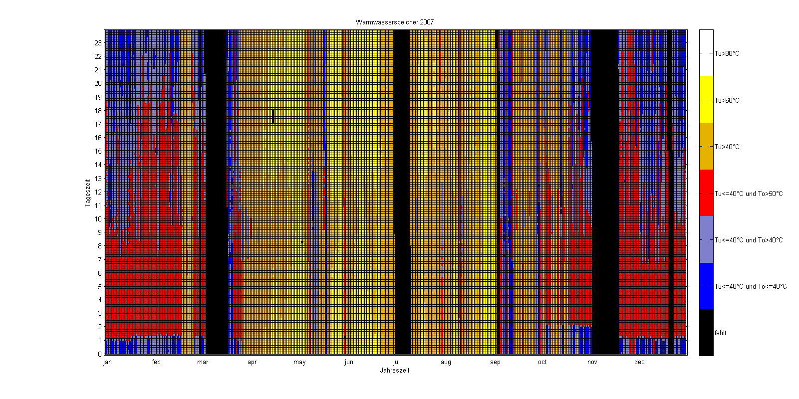 Die folgende Klassifizierung der Temperaturen im Wasserspeicher ist so gewählt, dass rote Bereiche im wesentlichen den Einsatz der Gasheizung anzeigen. Gelb und orange ist ein Zeichen dafür, dass die Solaranlage das Wasser soweit erwärmt hat, dass die Heizung nicht oder kaum nachheizen musste.