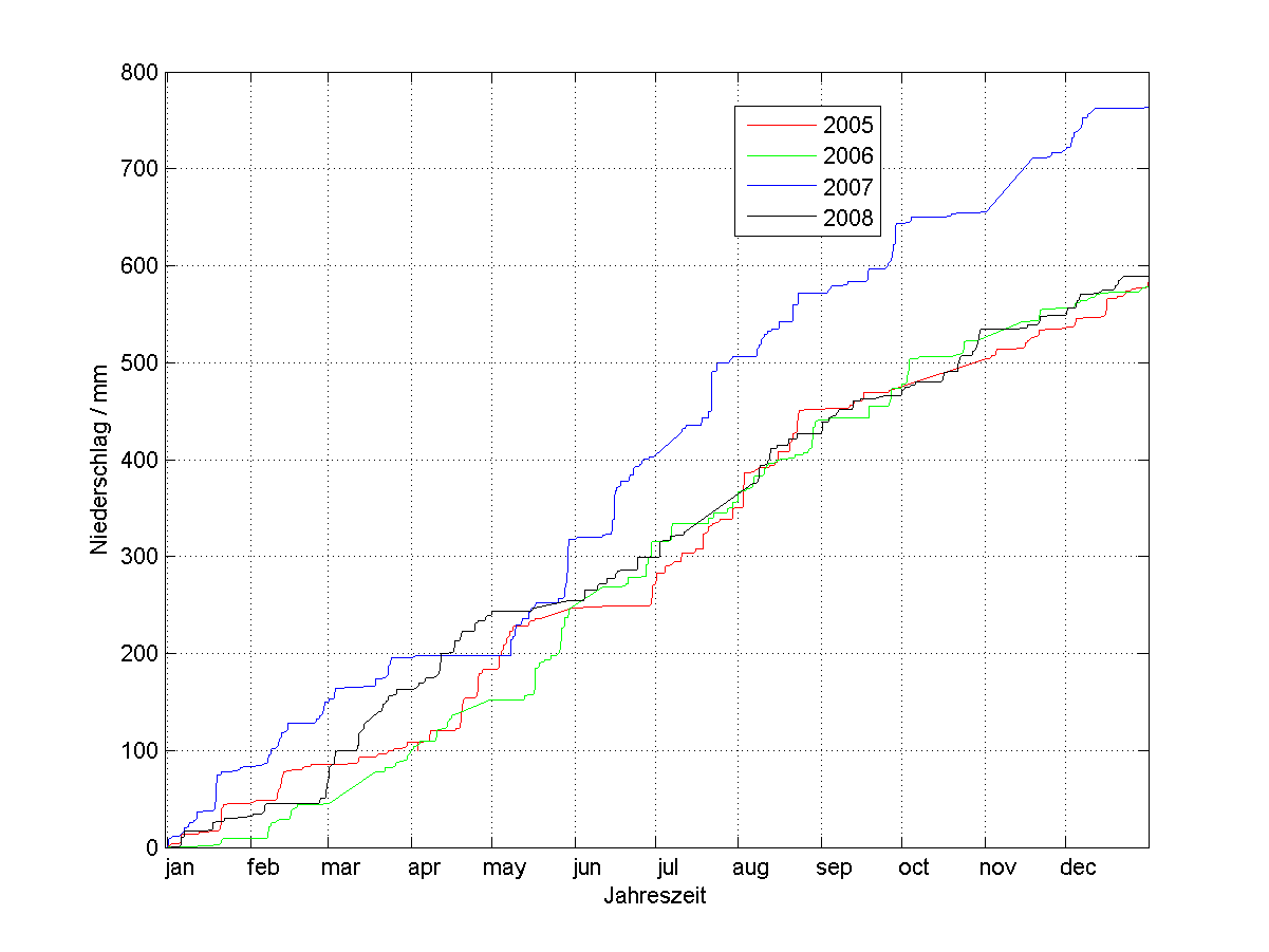 Neben den Etragsdaten zeichne ich auch die Regenmenge auf. Hier fällt das Jahr 2007 mit viel Regen aus dem Rahmen, ansonsten liegen die Jahreswerte immer bei knapp 600mm. Zum Vergleich: Wetteronline zeigt bei Nürnberg (das ist die nächste Station zu Erlangen) für 2007 einen Niederschlag von 812mm und im Mittel für die Jahre 2005-2008 einen Niederschlag von 620mm - die Größenordnung passt also.