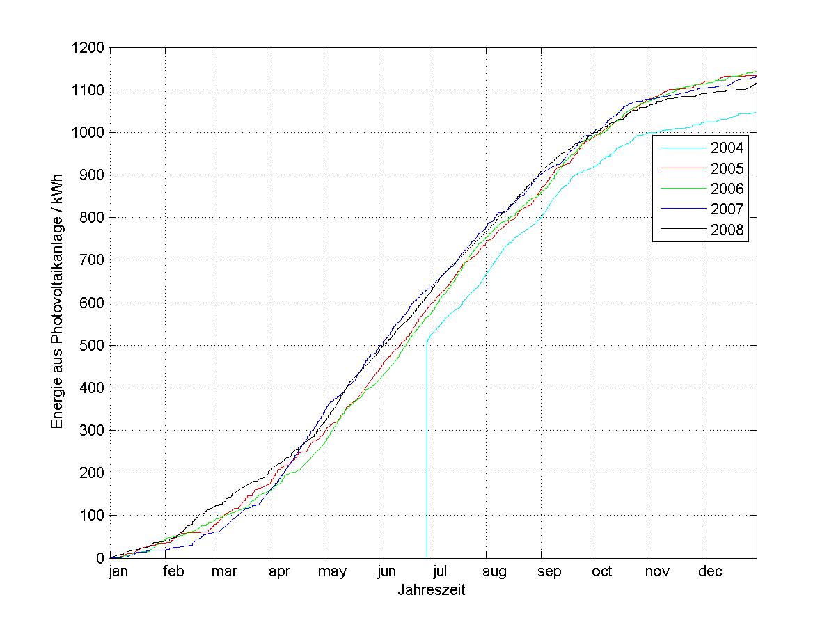 Folgendes Bild zeigt die eingespeiste Energie für die bisherigen Betriebsjahre. Man erkennt z.B. das durchgängig schöne Wetter im April 2007 an dem steilen Anstieg der Kurve. Die kleinen Wellen geben den Tagesverlauf wieder (Bild dazu ggf. in voller Auflösung anschauen). Der vollkommen gerade Verlauf Anfang März 2007 (ohne Tageswellen) ist durch fehlende Messwerte entstanden. Die Kurve für 2004 zeigt, dass ich seit Ende Juni 2004 Werte aufzeichne. Die Kurve beginngt etwas zu tief, der Ertrag 2004 war in Wirklichkeit 1164kWh.