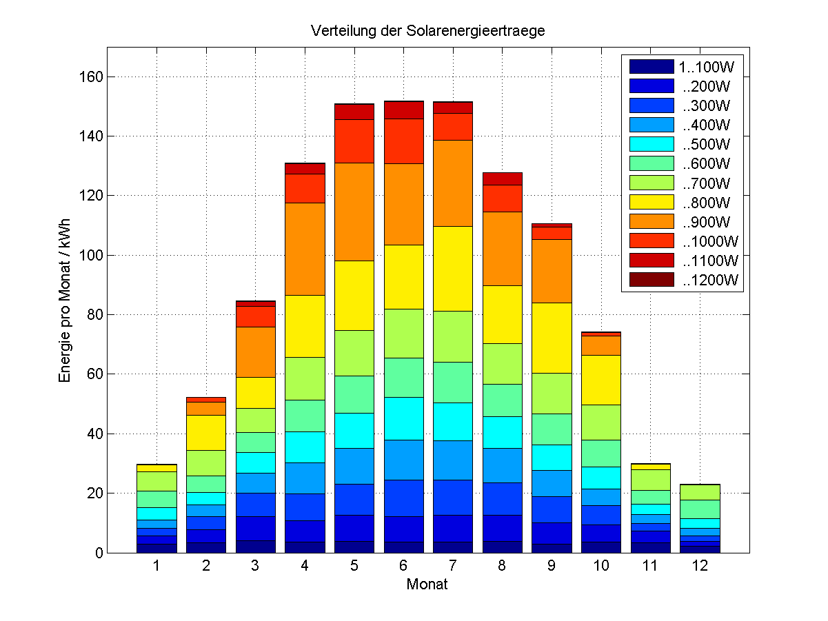 Betrachtet man die bei verschiedenen Leistungen eingespeiste Energie, so ist der Energiebeitrag der höheren Leistungen natürlich größer als der zeitliche Anteil. Die Gesamthöhe der Säulen zeigt die im jeweiligen Monat eingespeiste Energie (über die Jahre gemittelt). Der Steile Abfall von Oktober zu November entspricht auch dem Gefühl, dass im November neben der ungünstigeren Sonnenstellung auch noch das Wetter schlechter wird, es also wirklich überproportional weniger Sonne gibt.