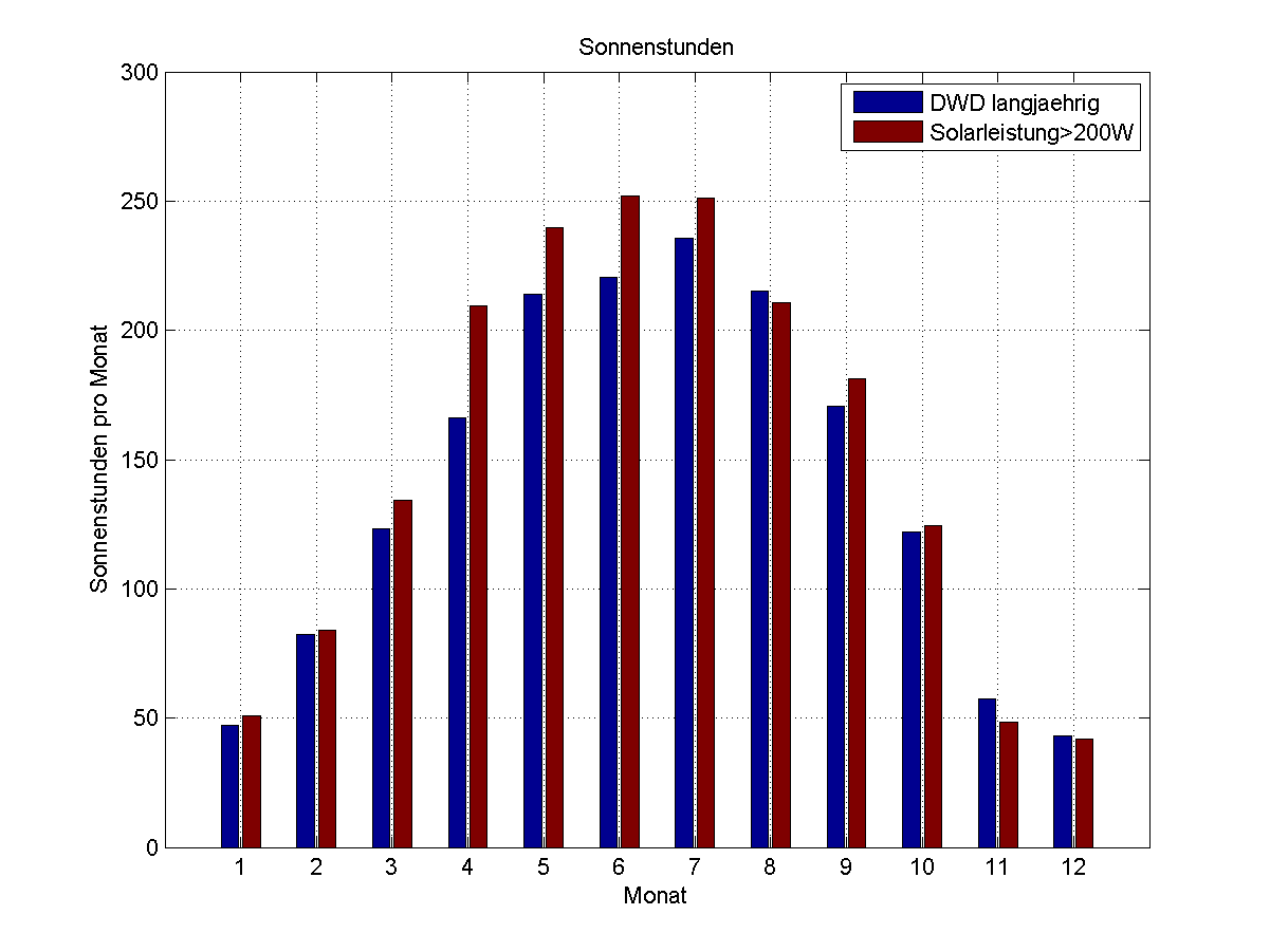 Hier zum Vergleich die Anzahl von Stunden, die mehr als 200W eingespeist werden (über die Betriebsjahre gemittelt) und die vom DWD für die Region Erlangen/Nürnberg angegebene mittlere Sonnenscheindauer (langzeitmittel). Beides passt recht gut zusammen. Auch hier fällt der steile Abfall im November auf.