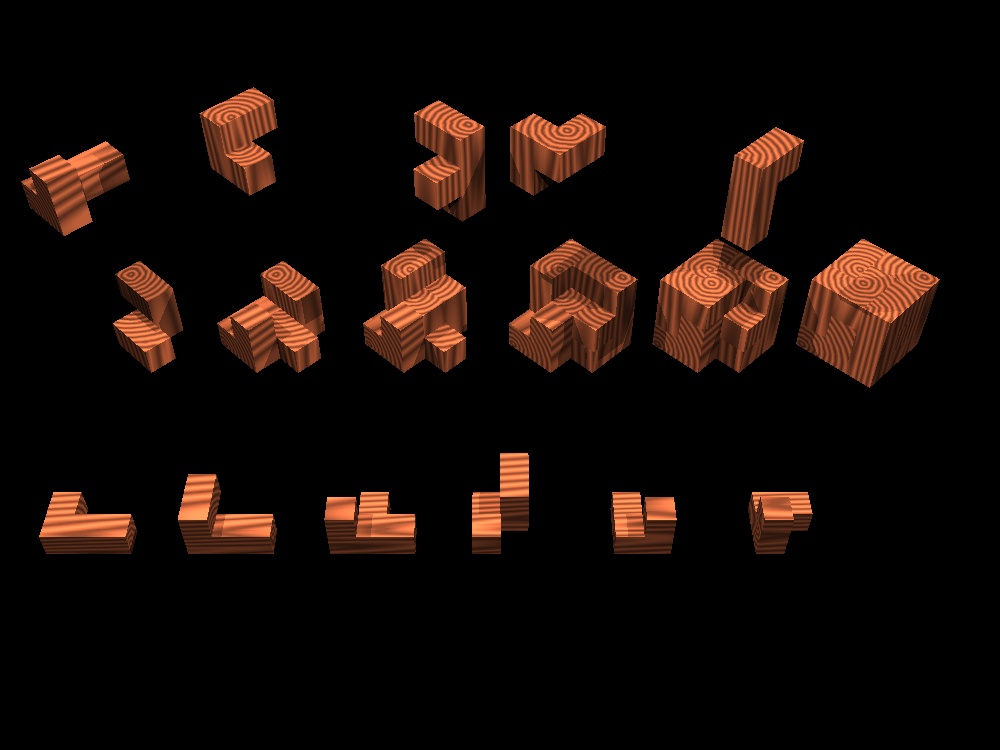 Die folgenden Abschnitte stellen ein C-Programm zur Loesung dieses Puzzles und ein Povray-Script zur anschaulichen Darstellung der Loesung vor. Das Archiv wuerfel_v1.zip enthaelt alle benoetigten Dateien.